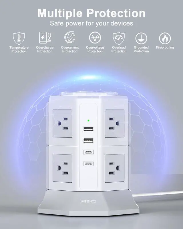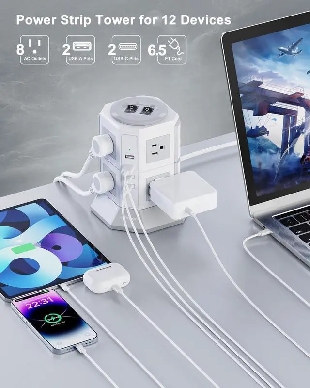 12 IN 1 FLAT PLUG OUTLET EXTENDER: The surge protector power strip tower expands 1 wall outlet into 8 125V/10A AC power outlets, 2 5V/2.4A USB-A ports, and 2 5V/3A USB-C ports, while supporting the charging of up to 12 devices. AC outlets are spaced up to 2.95 inches apart to accommodate virtually any size plug. Lets you keep your desktop tidy.