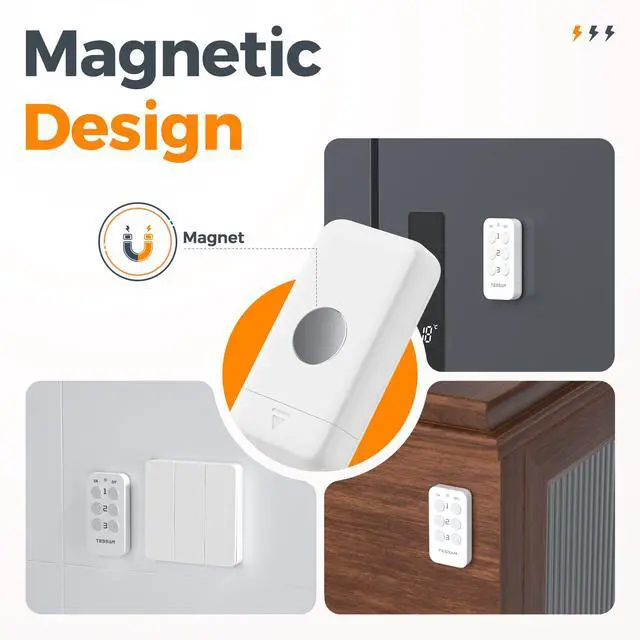 Remote control with magnets on the back to attach to metal surfaces such as refrigerators, doors, etc; Or be placed on non-metallic surfaces by the iron tab (included with package).