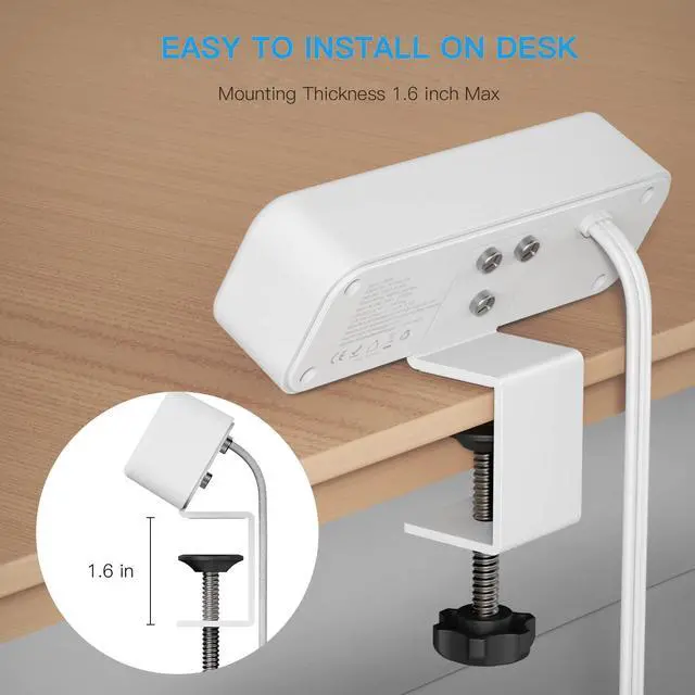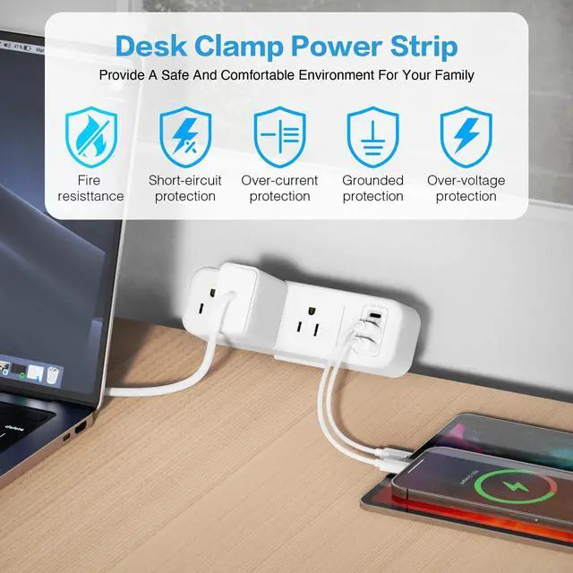The desktop power strip clamps at the edge of the table, or you can mount it on the table legs for more space-saving. You can get your phones, tablets and laptops charging just at your arm's reach.