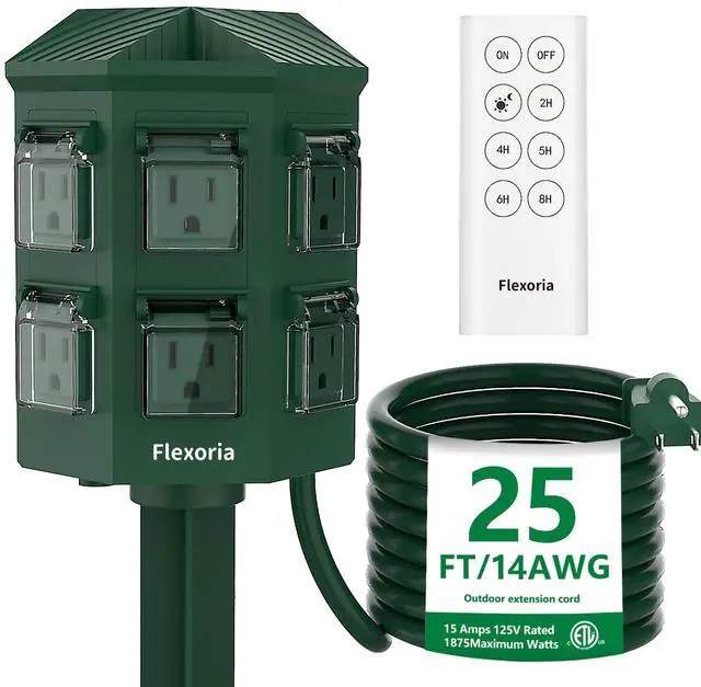 Outdoor Power Stake Timer, Remote Control Dusk to Dawn Light Timer, 25FT Extension Cord Waterproof, 6 Grounded Outlets for Outdoor Christmas Decorations, ETL Listed