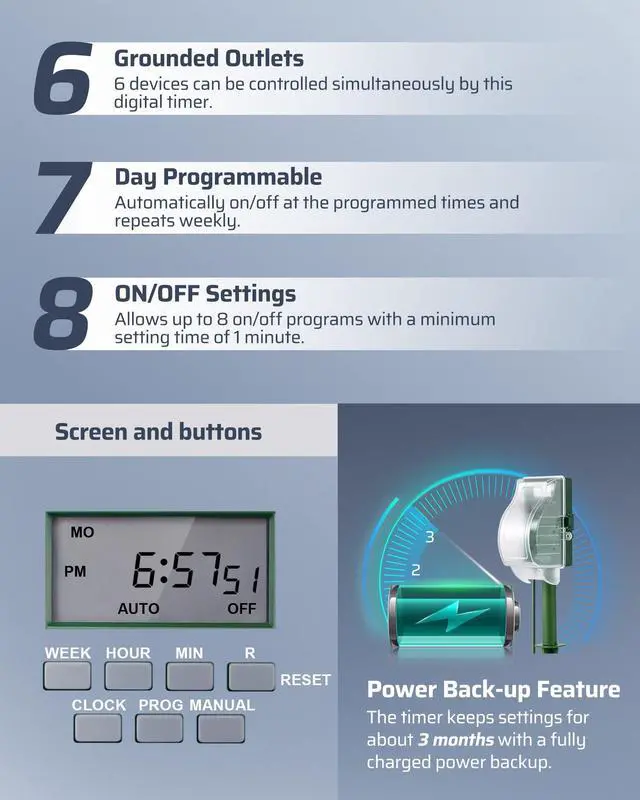 Up to 8 different sets of timings with super clear LCD display, schedule your devices on/off at desired time.