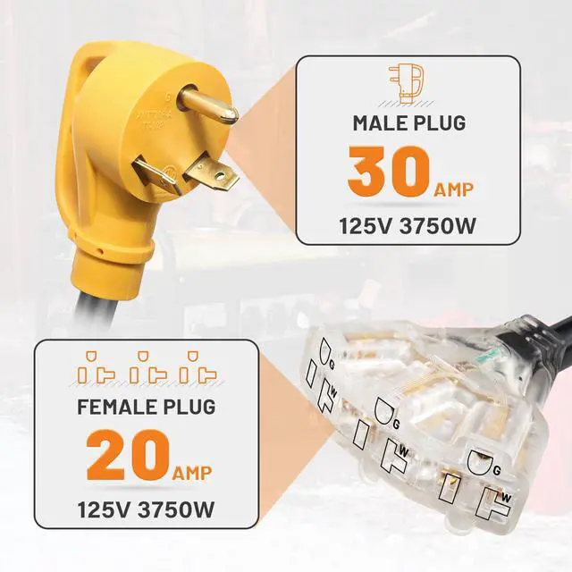 Take advantage of this adapter to power multiple devices, grills, TVs, or audio equipment during tailgating parties, sports events, or outdoor gatherings. Can be used for RV camping,and construction and industrial purposes.