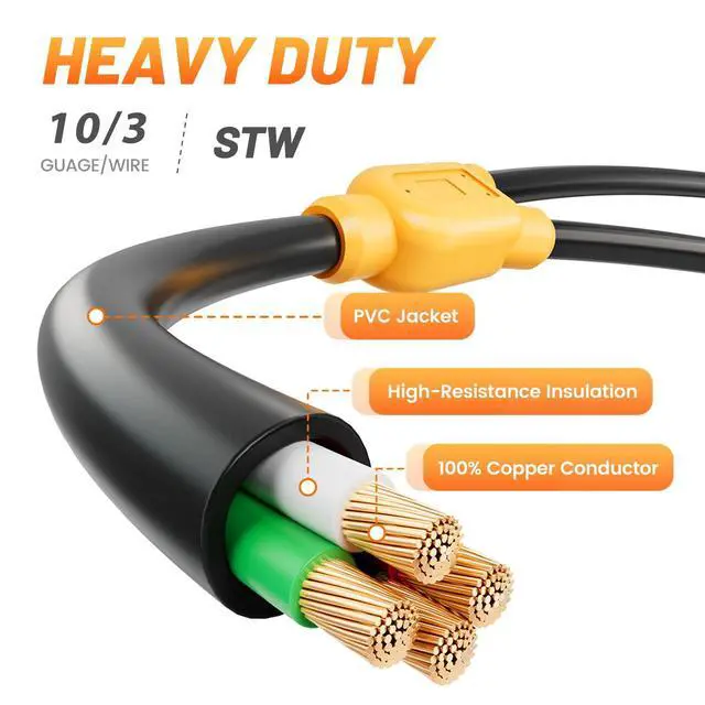 Molded plug, copper wiring coated wire, heavy duty flame retardant, UV-resistant, STW indoor/outdoor water resistant PVC jacket in UL 62 standard, and plug in UL 817 standards. ETL Certified Approved to better protect your RV.