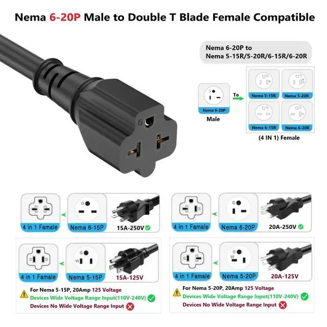 AdcAudx Nema 6-20P 20 Amp to 20 Amp T plug adapter cable, male side is Nema 6-20P 250V 20 Amp plug, Female side is Nema 5-15R/5-20R/6-15R/6-20R 4 in 1 T Blade outlet (Double T outlet) comb 15/20 amp plug adapter extension cord 6 foot, Nema 20R Comb 15Amp & 20Amp AC Power extension cable, 20Amp to 20Amp extension cable provides a solution with Double T-blade 20 amp outlet extender, build with SJTW, 12AWG 20 amp power cord, 20 Amp copper wire with a 300 Volt jacket, The Nema 6-20 plug adapter cable let you very easy offers an alternative to hiring electrician from current 6-20R 250 volt 20 Amp outlet.