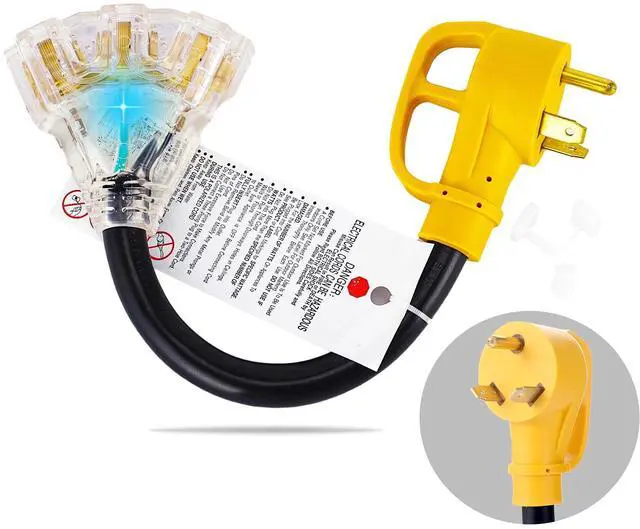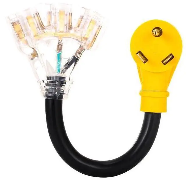 30 Amp to 20Amp 110V RV Generator Adapter Cord,NEMA TT-30P Male Plug to 3X5-15R/5-20R Female T-Blade Household Connectors with LED Indicator, 1 FT