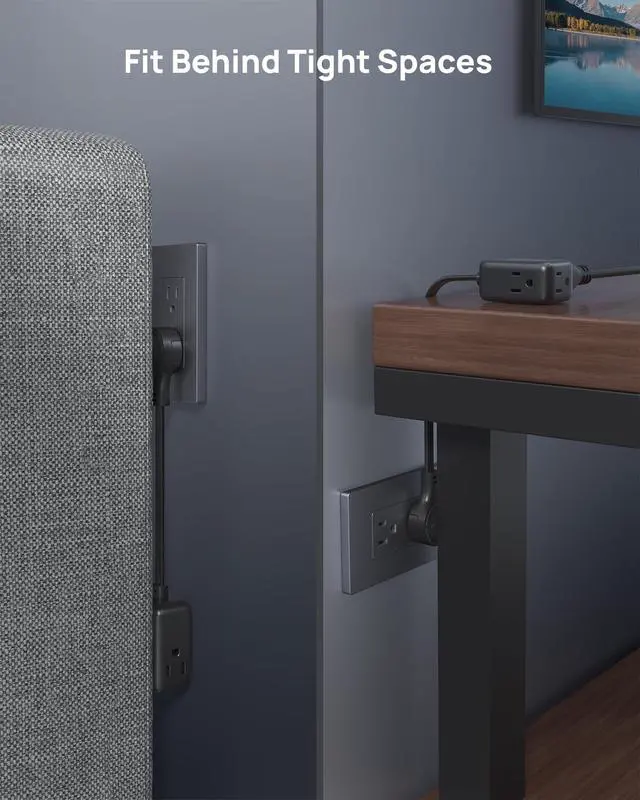 The mini size of this multiple outlet wall plug is perfect for areas with limited space like behind bureaus, cabinet, vanity, desk, couch, shelves, tv. Its compact design allows you to tuck it neatly behind furniture and put furniture against the wall as close as possible.