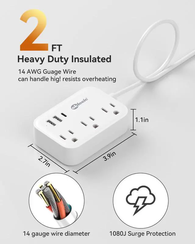 Power strip with 2 USB A Ports and 1 USB C Port Built-in smart charging technology that detects.