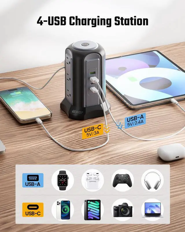 This USB C power strip is equipped with 5 rubber feet at the bottom, ensuring it stays in place and prevents any scratches to the desktop.
