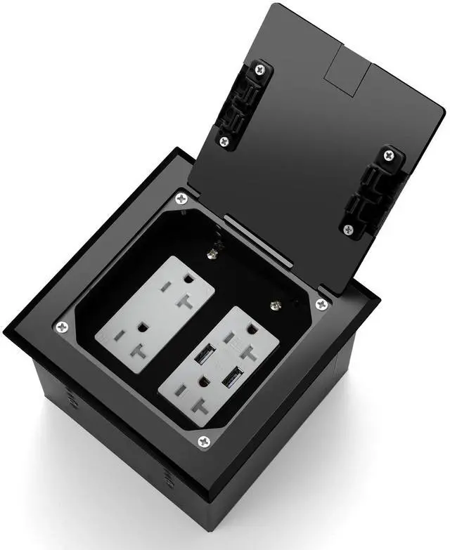 Recessed Flat Hidden Floor Electrical Outlet Box Kit, Stainless Steel Cover with 4 * 20A Tamper-Resistant Receptacle Outlet, 2 * 5V/ 4.8A USB Port, ETL Certified, Black