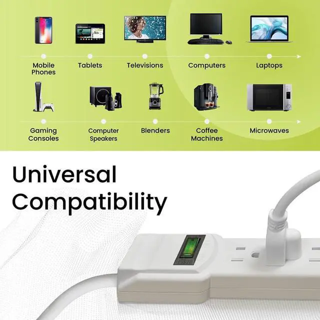 6 Outlet Surge Protector: Provides 250 joules of simultaneous protection against electrical power surges for its 6 adaptors, all at once, making it ideal for almost any indoor electrical appliances.