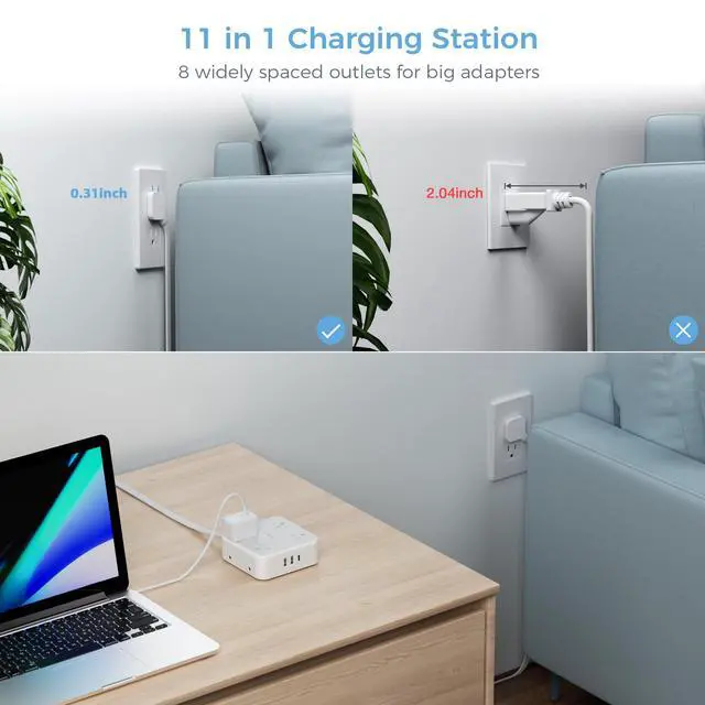 3-sided design that makes it easier to make the plugs not covering any outlet, and the 8 AC outlets with 1.9 inches long space in between. Larger spacing makes it easier to use for all kinds of equipment. The compact design saves more space, suitable for the home, office, college dorm room and travel