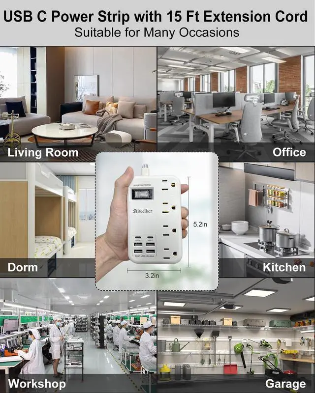 6 USB Surge Protector Power Strip with 15 FT extension cord