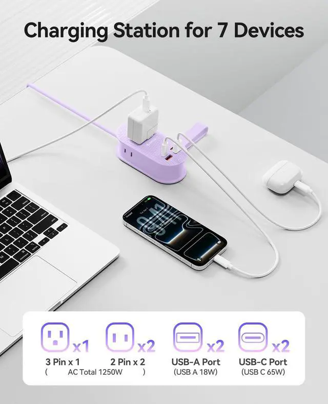 7-in-1 Charging Station: Charging station simultaneously supports 7 devices, including 3 AC outlets, 2 USB-A(18W), and 2 USB-C(65W), USB total output(45W+12W). You can also supply power to household appliances such as projectors, monitors, or hair dryers, making it perfect for charging at home, offices, libraries, dormitories, travel, cruise ship (no surge protector) and other places