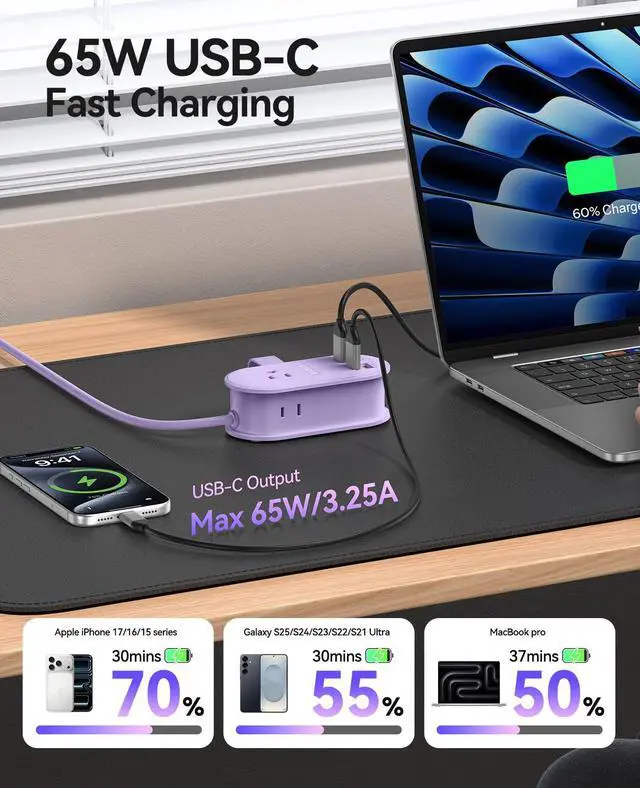 GAN 65W PD Fast Charger: GaN technology to significantly reduce energy loss and heat generation. The USB-C port provides a maximum output of 65W. It can charge your smartphones, tablets, and laptops all at once,which can charge an iPhone17 to 70%(30 minutes), a Galaxy S25 to 55% (30 minutes), and a MacBook Pro to 50% (37 minutes)