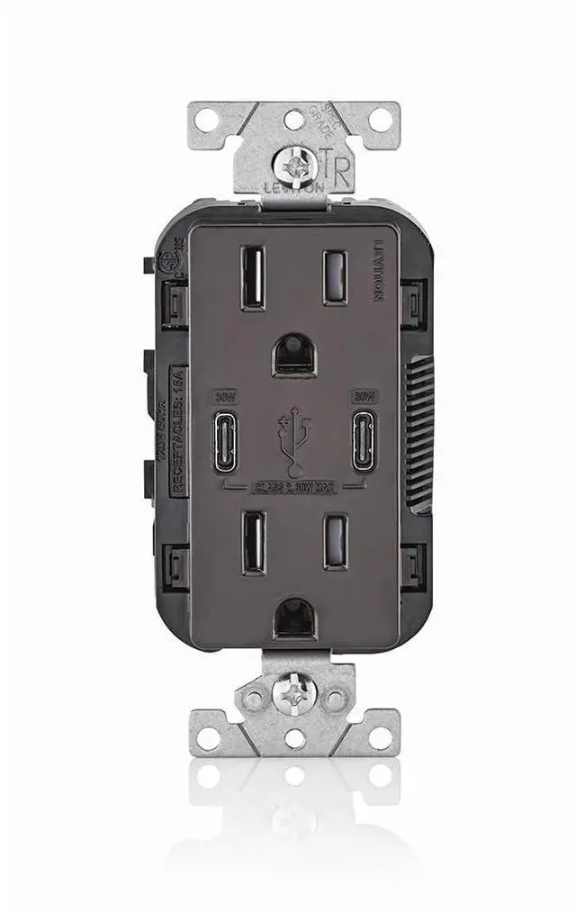 Leviton 30W (6A) USB Dual Type-C/C Power Delivery In-Wall Charger with 15A Tamper-Resistant Outlet, USB Charger for Smartphones, Tablets, Laptops, T5635-B, Brown