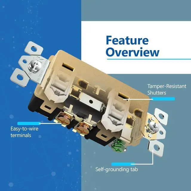 • Child safe tamper-resistant decorator receptacle increases safety by preventing unwanted objects from being inserted; complies with 2017 NEC Article 406.12