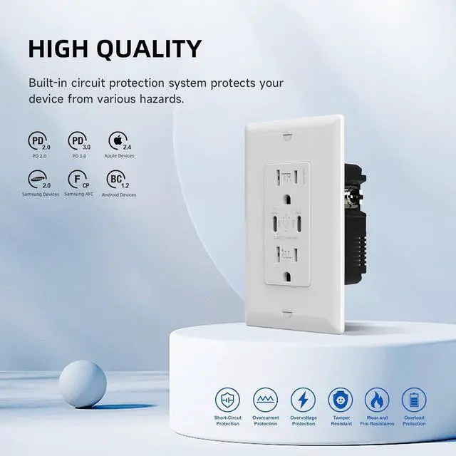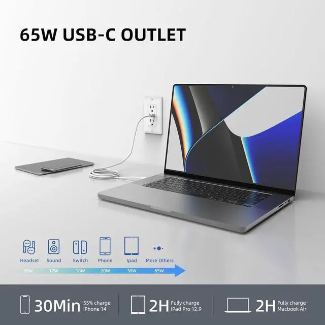 4× FASTER CHARGING: USB receptacle outlet deliver the optimal power output to charge different device at full speed; Charges iPhone 13 up to 4× faster speed than the original 5W charger at high speed; Fully charge 2020 MacBook Air within 2 hours