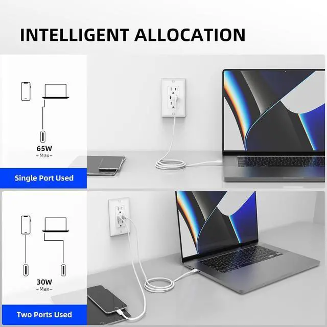 HIGH SPEED CHARGING: Connecting a single device each type C port allows for a maximum charging power of 65W; When Type C1+Type C2, each port supports up to 30W fast charging
