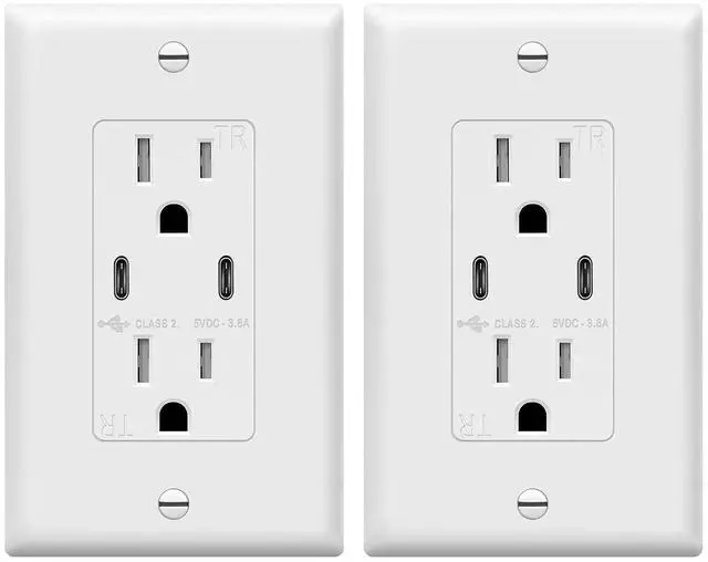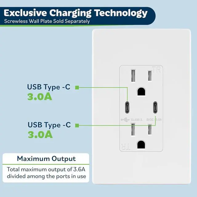 In-wall 2-port USB charging outlet with an output of 2.4A per port (for a total max output of 3.6A ); includes 2x Type-C USB ports and 2x 15A tamper-resistant plug outlets; does not support fast charging technologies