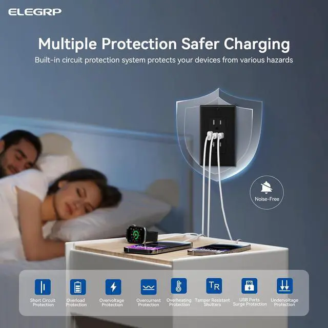 Durable Design Constructed with fire-resistant materials and multiple protections for family safety. Child-proof shutters prevent accidental insertions, and USB ports have surge protection. Type C ports tested for 10, 000 insertions, Type A for 8, 000. FCC, UL& cUL Certificated.