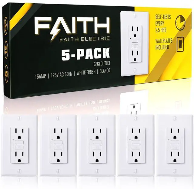 5 pack. Each pack includes (1) 15Amp white GFCI receptacle, (1) 4.59 " x 2. 76" white wall plate, (2) screws, installation manual, stickers, US-based customer support.
