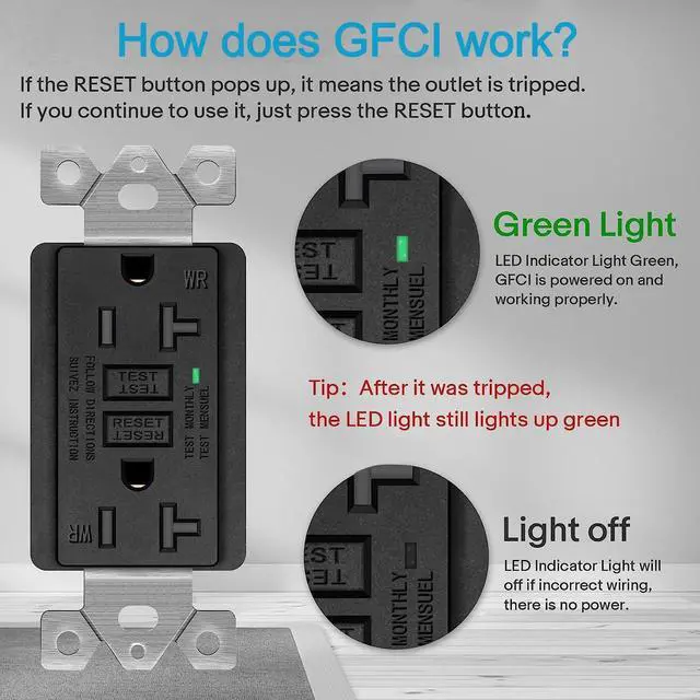 Safe 20Amp GFCI Outlet BlackCompared to conventional outlets, with an added leakage protection technology. When there is a leakage in the circuit at home, the GFCI can auto respond to a ground fault in time, trips on actual ground fault. Safer and more adaptable to the needs of modern life. Fireproof polycarbonate shell manufacturing, weather resistant. Have prevented many accidents in the home, such as electric shock, fire, to keep people safe.