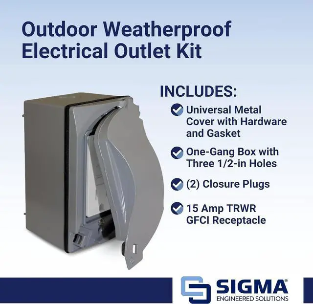 Complete kit includes universal cover, one-gang box with three 1/2-in holes, GFCI receptacle, closure plugs, hardware and gasket