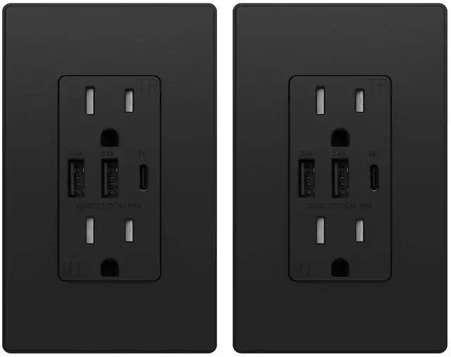 ELEGRP USB Outlets Receptacles, 3-Port Wall Outlet, 30W 6.0A Electrical Outlet, 15 Amp Tamper-Resistant Outlet with Type C Ports, UL Listed, Wall Plate Included, 2 Pack, Matte Black