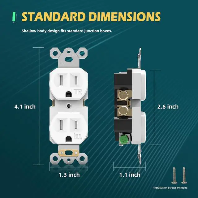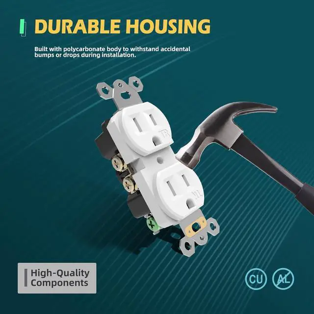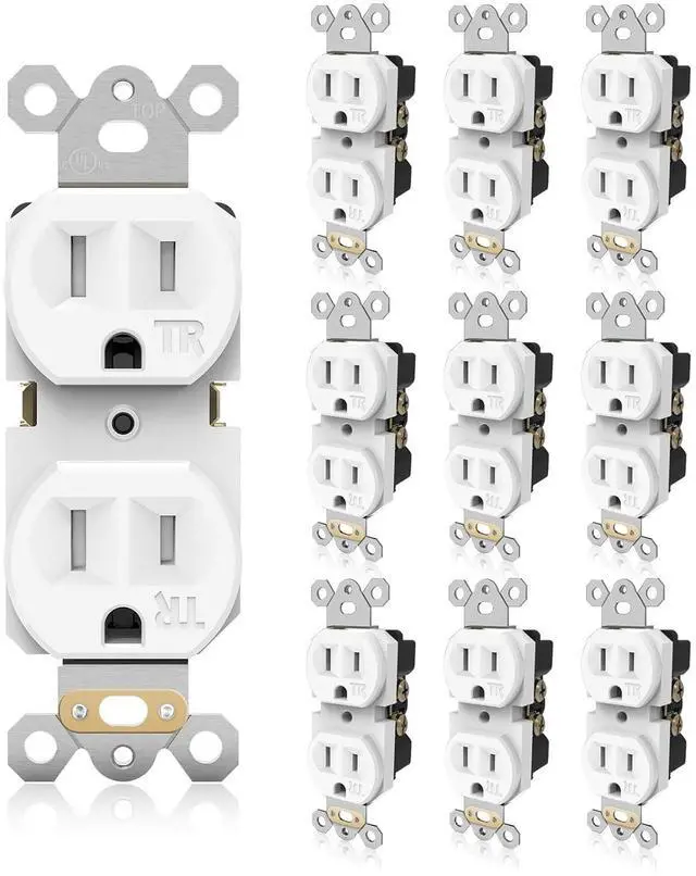 Duplex outlet receptacle features tamper-resistant shutters to prevent unwanted objects from being inserted, adding a sense of security for children. Complies with 2017 NEC Code