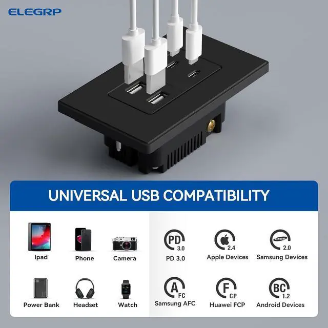 Universal Compatibility Compatible with all kinds of USB devices with multiple charging protocols including PD 3.0, Apple Protocols, Samsung Protocols, Huawei FCP, Samsung AFC and Standard BC 1.2. Meets a variety of charging requirements to make sure your devices are charged at blazing-fast speeds.