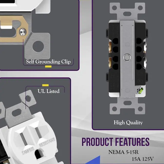 Complies with 2017 NEC, Article 406.12 for tamper-resistant receptacles. 15A 125V, 5-15R, self-grounding, 2-pole, 3-Wire. UL94, V2 Rating, 1-year warranty, UL Listed
