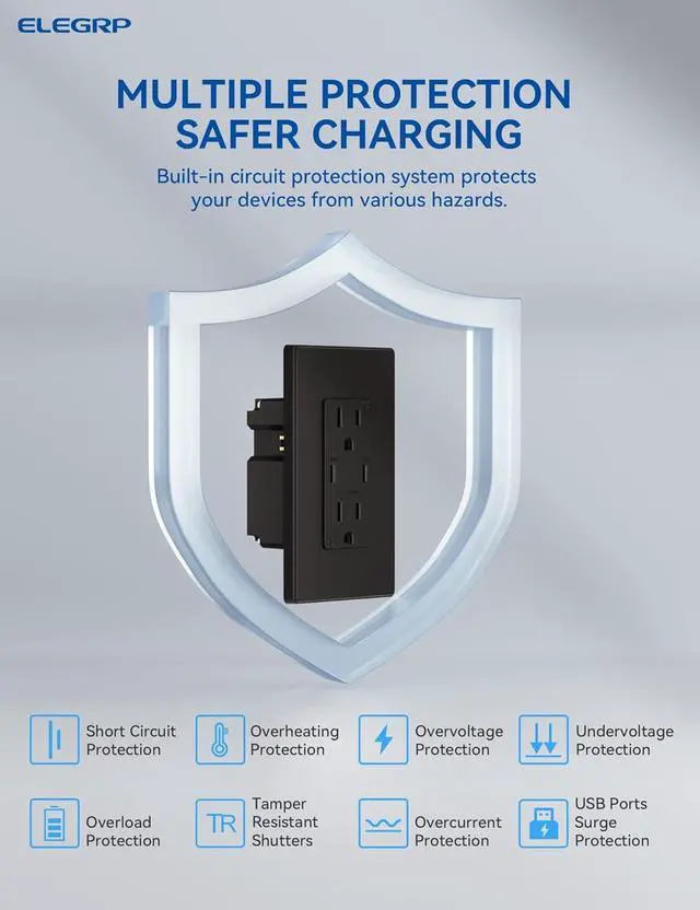 Durable Design Exquisite matte finish and frameless design looks best with today' s decors. Tough thermoplastic housing shrugs off impacts and scratches. Heavy duty design is made to last. Works with 12 or 14 AWG for back wiring. Replace an existing outlet in as short as 10 minutes. A screwless wall plate and complete installation instructions included. Compatible with all electrical boxes, decorative devices and wall plates. FCC certificated. UL and CUL listed.