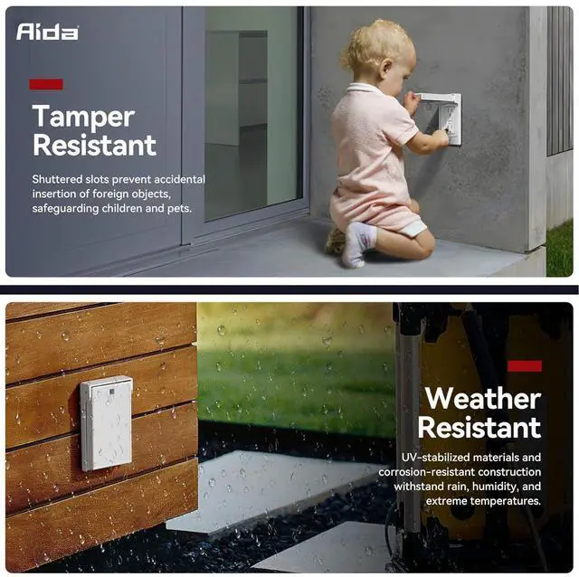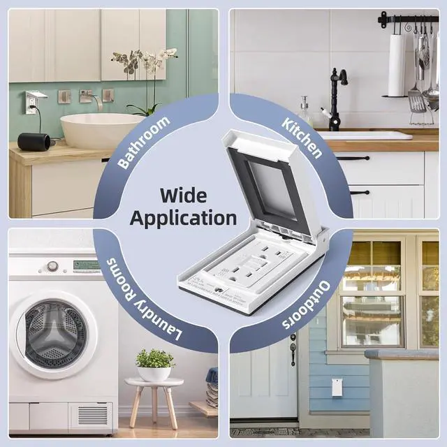 Tamper-Resistant+Weather Resistant+Weatherproof CoverBuilt-in self-closing cover blocks rain, snow, and dustno extra purchase needed. Made with UV-resistant materials to withstand corrosion, extreme temps, and sun exposure. Perfect for outdoor, bathroom, kitchen, and garage use.