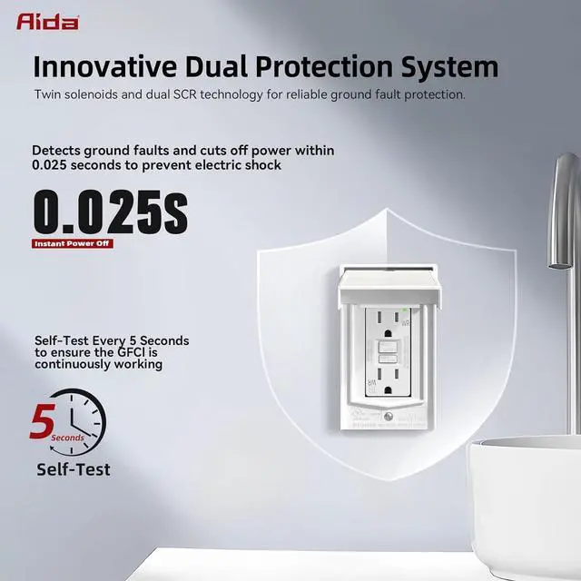 Patented Auto Self-Test Every 5 Seconds+ Instant 0.025 s power cutoff This GFCI outlet automatically performs a self-test every 5 secondsfar more frequently than the UL standard of every 3 hoursto ensure it' s always ready to protect against electrical shock. In the event of a ground fault, it cuts power in just 0.025 seconds