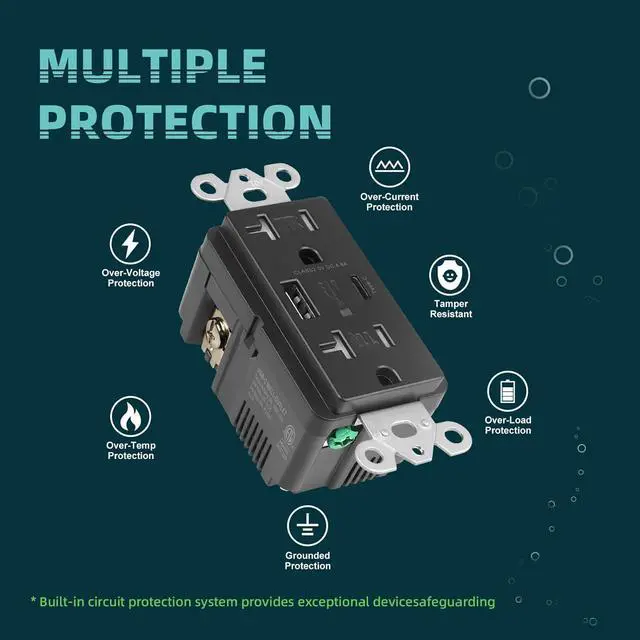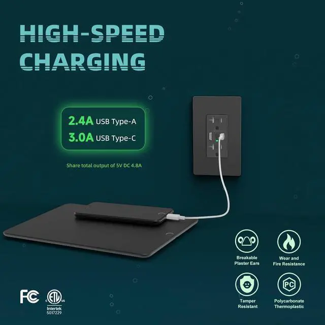 Multiple Protection: USB Wall Charger Outlet made with flame-resistant materials that meets the UL94 standard. It' s further fortified with integrated safety mechanisms, shielding your devices from possible threats such as overcurrent, short circuits