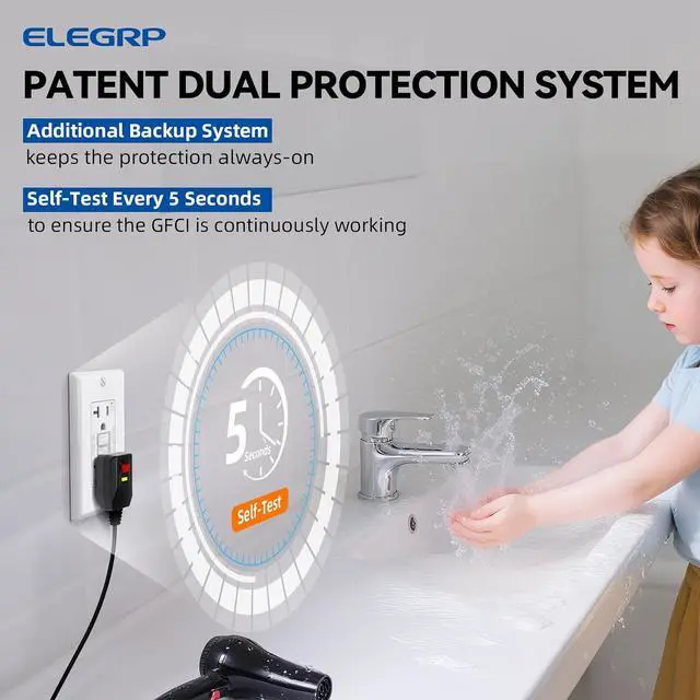 • Patented Self-Test Every 5 Seconds This GFCI outlet automatically performs a self-test every 5 secondsfar more frequently than the UL standard of every 3 hoursto ensure it's always ready to protect against electrical shock. In the event of a ground fault, it cuts power in just 0.025 seconds, providing fast and reliable safety for your home.