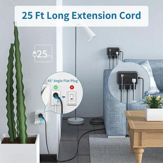 25 Ft Extension Cord with Flat Plug The 25 ft black extension cord gives you the flexibility to reach distant outlets and hard-to-reach places. The 25 Ft extension cord can provide the perfect solution when power outlets are not conveniently located nearby. The flat plug extension cord features a low profile that fits easily in tight spaces like behind furniture, bookshelves, and desks, saving a lot of space, and moving furniture closer to the wall without bending the cord.