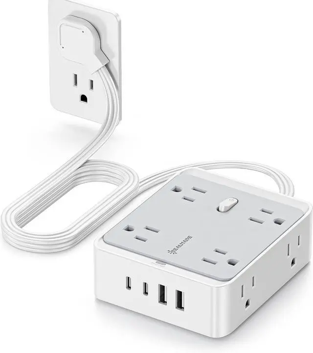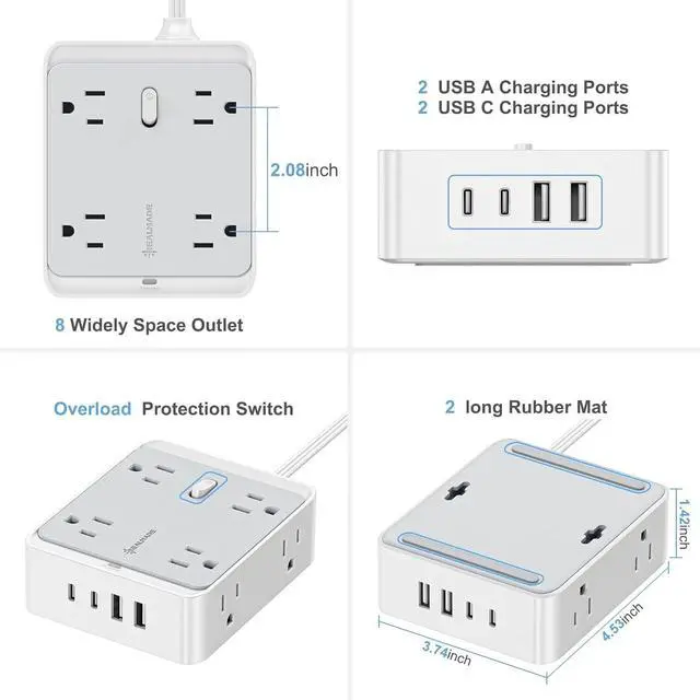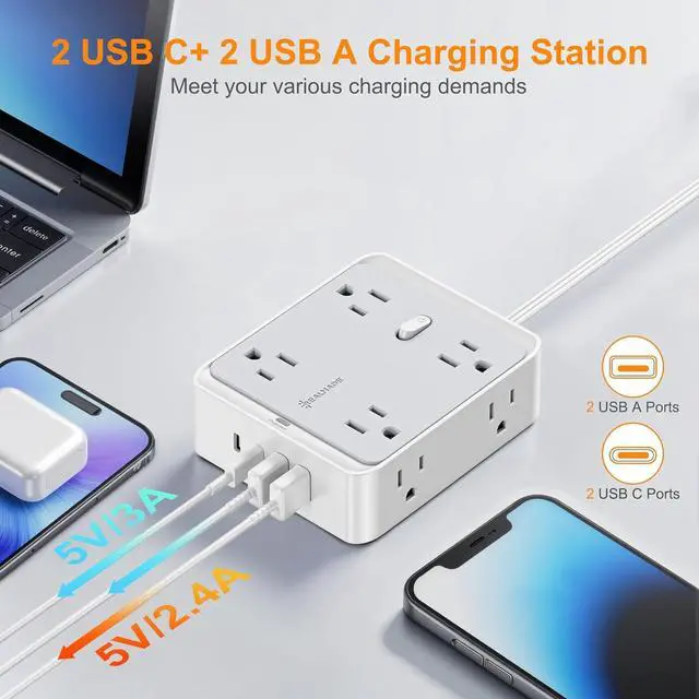 8 AC Outlets + 4 USB Ports (2A+2C) - This space-saving power strip transforms 1 socket into 8 widely spaced AC outlets and 4 USB charging ports (2 USB-A + 2 USB-C), allowing you to power and charge up to 12 devices simultaneously. The smart USB ports automatically detect your devices to deliver optimal, fast