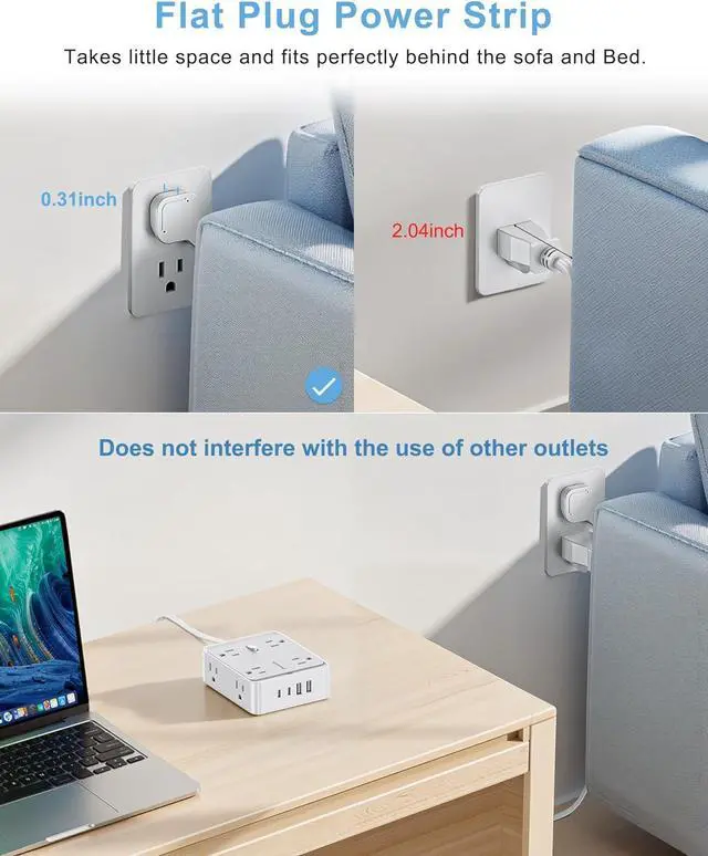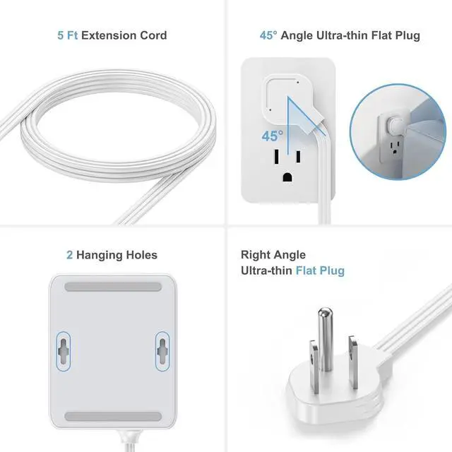 45° Ultra-Slim Flat Plug & Cord - Featuring a streamlined 45-degree right-angle flat plug and a flat extension cord, this power strip effortlessly slides behind furniture like sofas, beds, or desks. The ultra-thin profile sits flush against the wall, saving valuable outlet space and maintaining a clean, organized look in your home, office, or dorm.