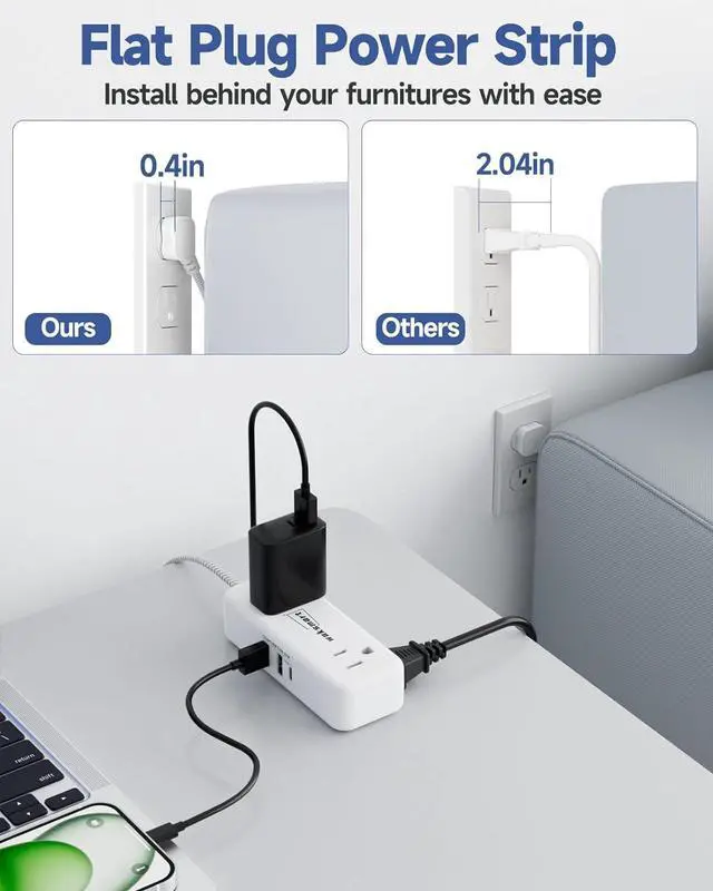 Ultra Thin Flat PlugMeasuring only 0.4 inches, the ultra-thin flat plug allows for easy installation behind sofas, TV cabinets, and other furniture. Its 45° right-angle design prevents the blocking of other outlets