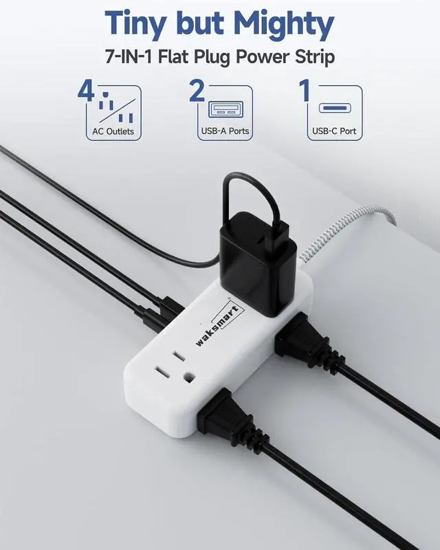 1 to 7 Flat Plug Power StripThis mini power strip has 4 wide outlets and 3 USB ports, expanding your wall outlet capacity from 1 to 7. It features a voltage range of 100V-250V and 2.4 IN wide space outlets, allowing you to power up to 7 devices simultaneously