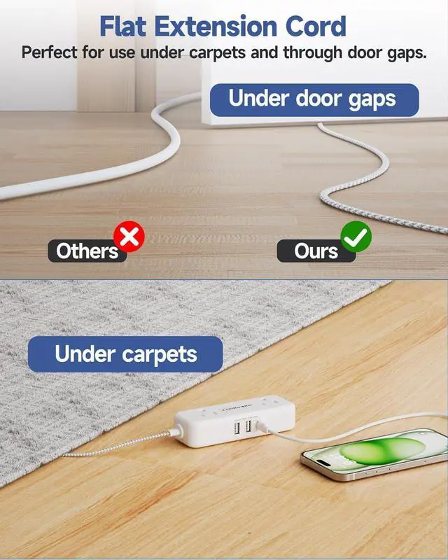 20 FT Flat Extension CordThe long extension cord provides flexibility in accessing outlets that are far away and difficult to reach. The braided cord is durable and only 0.15 inches thick, making it perfect for use under carpets and through door gaps