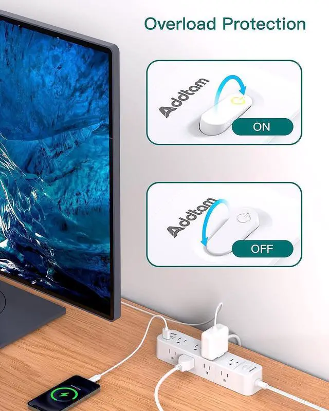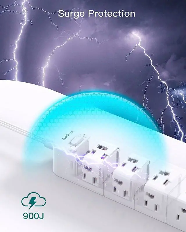 Power Strips with Surge Protection- 3 complementary surge protection circuits (TVS MOV GDT) with the minimum energy-absorbing capacity of 900 Joules. The overload protection switch can shut off automatically to keep your device safe. This flat power strip is also protected against over-voltage, over-current, over-charge, short-circuiting