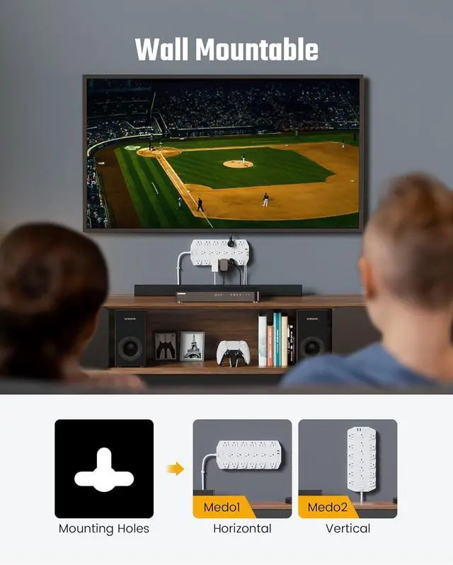 Easy Mountable There are 2 T-shape mounting holes on the back, with which you can mount this flat plug power strip on the wall horizontally or vertically, and prevent extension cords from tangling and overheating. Including 4 screws and 1 drill template, SUPERDANNY 22-in-1 power strip offers you an easy option to declutter your desktop by wall-mounting it.