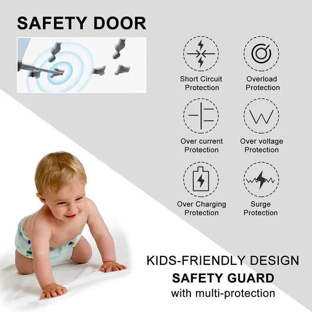 Childproof Design: Creative protection cover design safety door which is designed for protection of young children. This can effectively prevent children from electric shock which can occur if children are able to insert their fingers into the plug sockets.