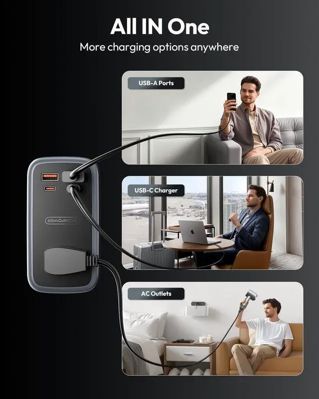 7-IN-1 USB Power Strip: Desktop Power strip supports 7 devices simultaneously, including 2 USB-C, 2 USB-A, and 3 AC outlets (1 Type B 3 Prong outlets, 2 Type A 2 Prong outlets(2 Prong outlets is non-polarized)). When you' re frustrated by the single outlet on the hotel bedside table, the portable power strip can solve your charging problems by powering multiple cell phones, watches, and laptops simultaneously. Perfect for frequent travelers and business trips.