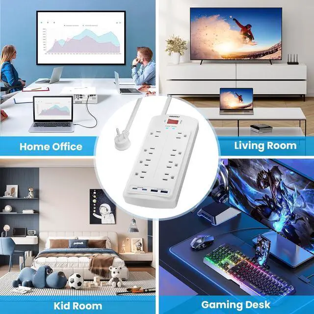 Surge Protector Power Strip with 8AC outlets & 4 USB- Surge Protector Power Strip with 8AC outlets & 4 USB Charging Ports (2 USB-C Fast Charging Ports), 5 Feet Flat Plug Extension Cord(1625W/13A), Surge Protector (2700 Joules) with overload protection protects against spikes and fluctuations. Wide range voltage design, can be used on 120v to 240v circuit.