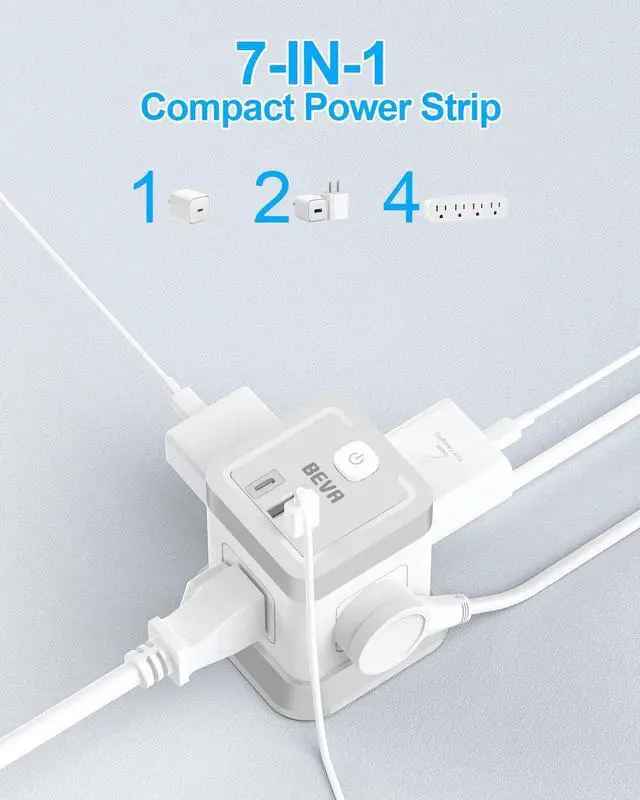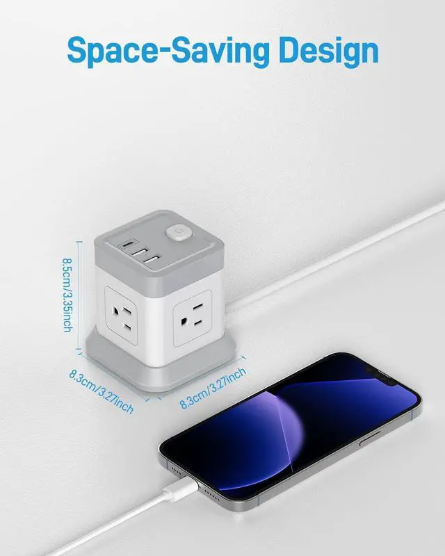 7 in 1 Power Strip CubeThe USB tower is equipped with 3 USB (1 USB C) charging ports and 4 AC outlets in different directions, Provide power for up to 7 devices at the same time and all side outlet is designed for large adapters to charge without blocking each other, save your space and keep your desktop organized. You can charge your phone, lamp, laptop and other devices together.
