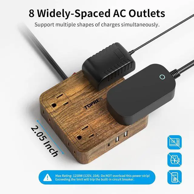 POWER STRIP: Features 4 3-pin AC outlets, 4 2-pin AC outlets, 1 USB-C and 2 USB-A ports, TOPREK power strip is perfect for charging multiple devices simultaneously, accommodates smartphones, tablets, laptops, and other electronics. Its efficient design and robust features make it a practical choice for modern lifestyles and travel essentials.