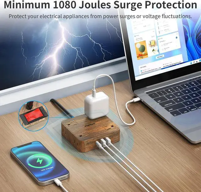 SURGE PROTECTION: Equipped with minimum 1080 joules surge protection, TOPREK power strip gives you peace of mind knowing that your devices are protected from power surges or voltage fluctuations. When voltage or surge is overwhelming, it will automatically cut power to protect connected devices, and helps to extend electronics lifespan and prevent potential damage.